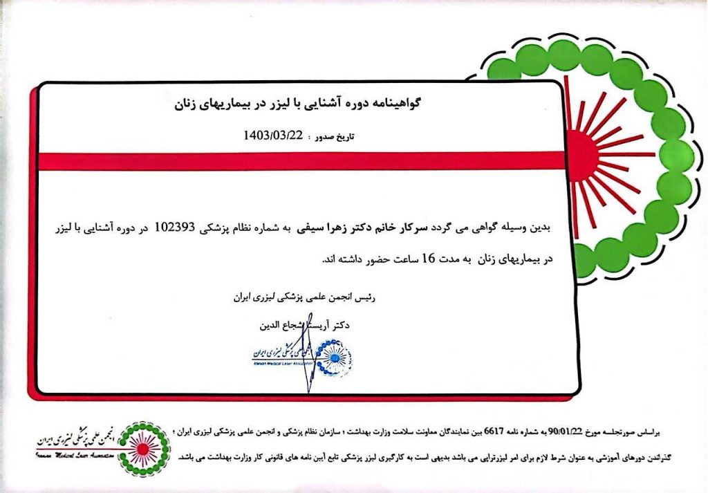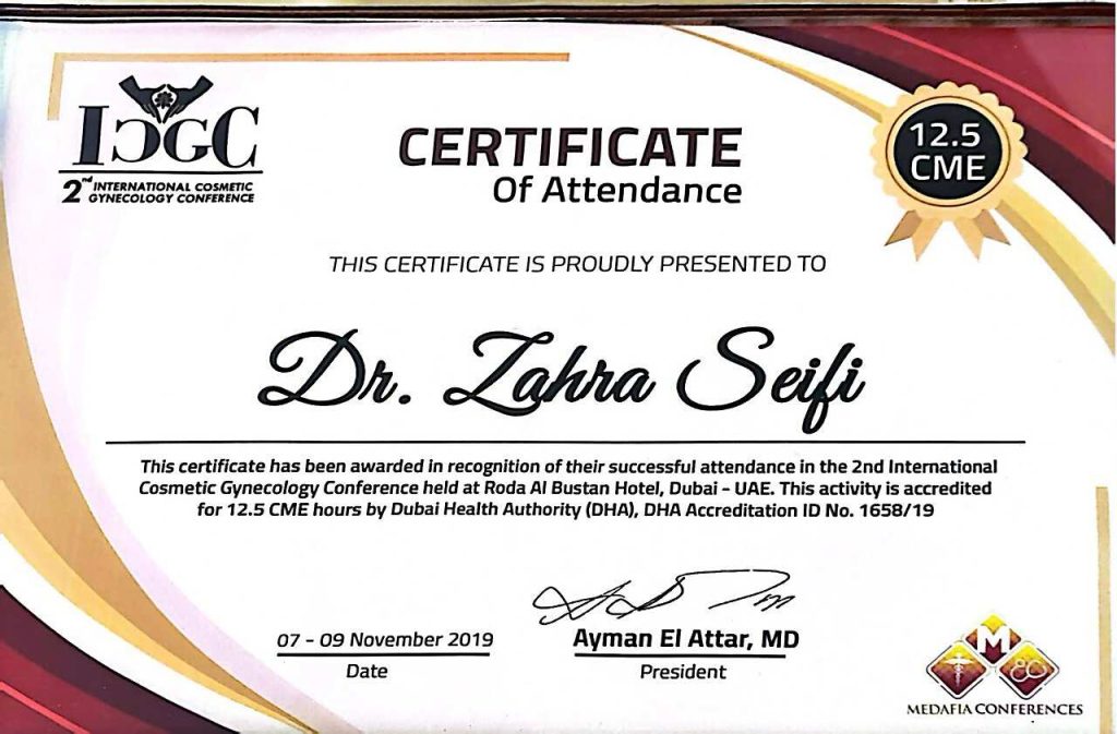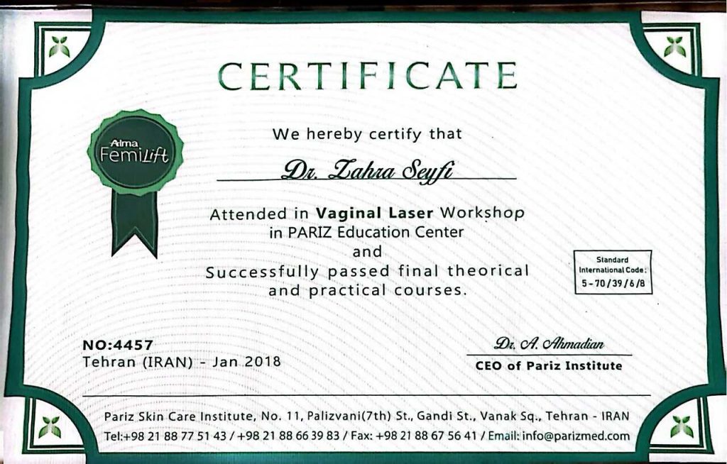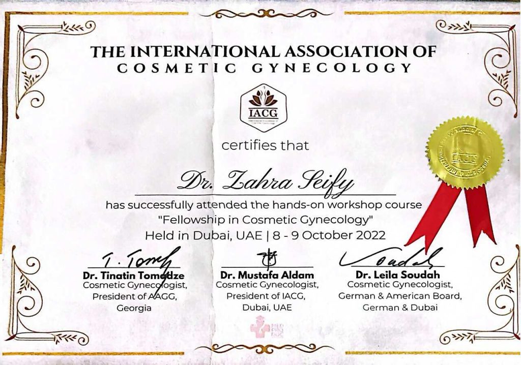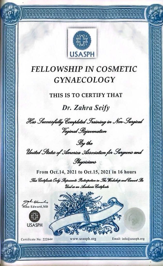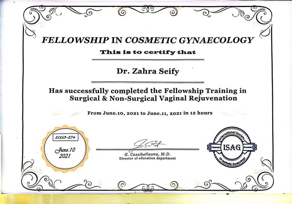 دکتر زهرا سیفی دورهای زیبایی زنان و فلوشیپ زیبایی زنان رو در کشورهای امریکا و امارات گذرانده اند و دارای تجربه بیش از ۲۰۰۰ جراحی موفق زیبایی زنان ( لابیاپلاستی و واژینو پلاستی و تزریق ژل و چربی به واژن ) میباشند. دارای بیشاز ۱۲ سال تجربه کاری در درمان و جراحی بیماریهای زنان