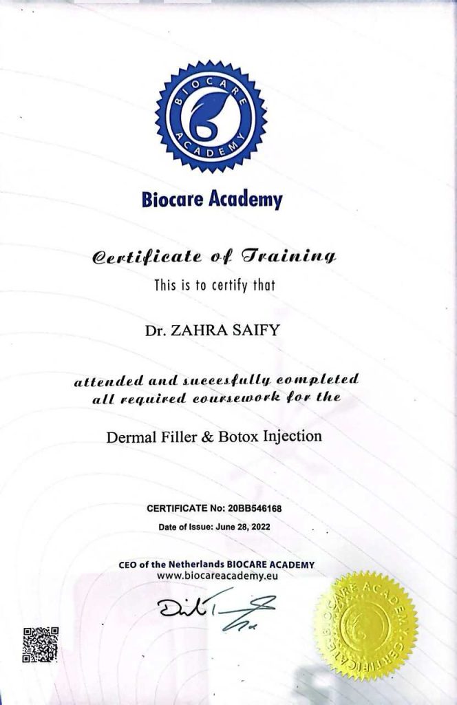دکتر زهرا سیفی دوره پزشکی عمومی خود را در دانشگاه علوم پزشکی شهید بهشتی تهران گذرانده و سپس تخصص زنان و زایمان را نیز در همین دانشگاه با رتبه علمی بالا به پایان رسانده است. ایشان دارای گواهینامهها و دورههای تکمیلی متعددی در زمینههای سونوگرافی زنان، درمان نازایی، زیبایی زنان و کولپوسکوپی هستند. علاوه بر آن، فلوشیپ زیبایی زنان را از مراکز علمی معتبر در آمریکا و دبی دریافت کردهاند. این دورهها شامل آموزشهای تخصصی در زمینه جوانسازی واژن، جراحیهای زیبایی ناحیه تناسلی، لیزردرمانی، تزریق چربی و تکنولوژیهای نوین پوست و زیبایی میشود.